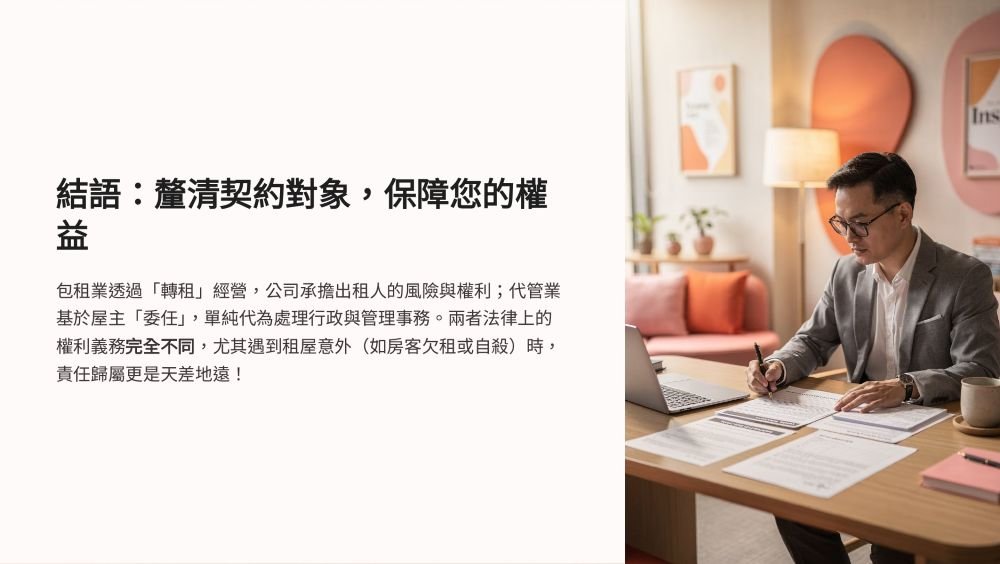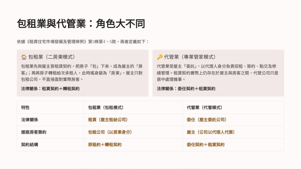 一個是「租給公司再轉租」,一個是「委託公司幫你管房」契約不同、責任不同,連出事時誰要負責也完全不一樣⚠️