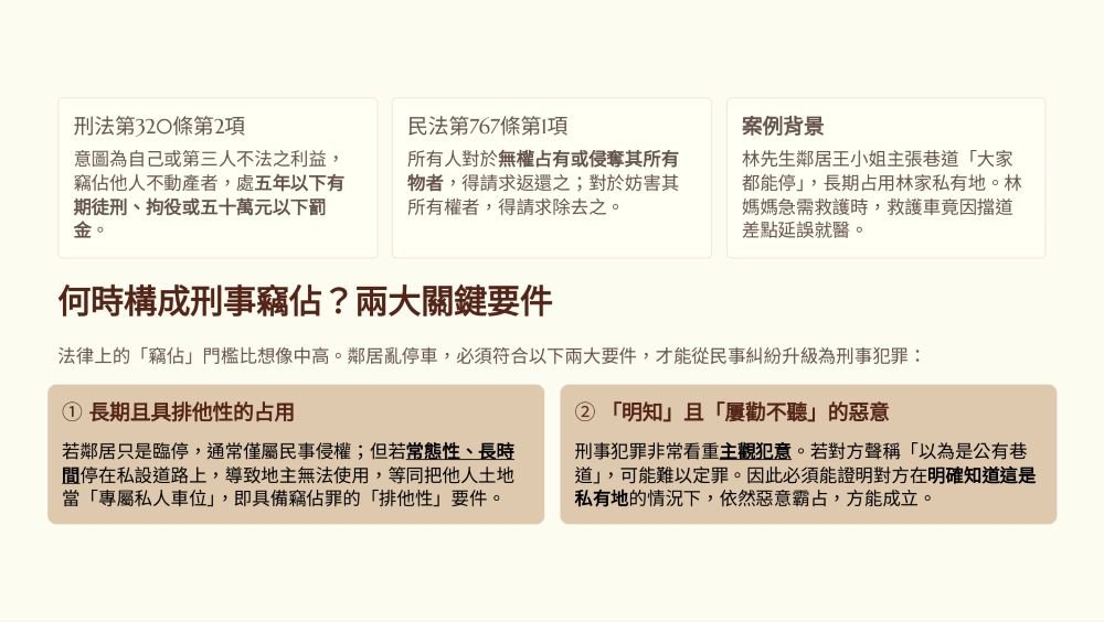每天「順便停一下」,結果連救護車都差點進不來!😱其實這不只是亂停車,嚴重可能構成「竊佔罪」!