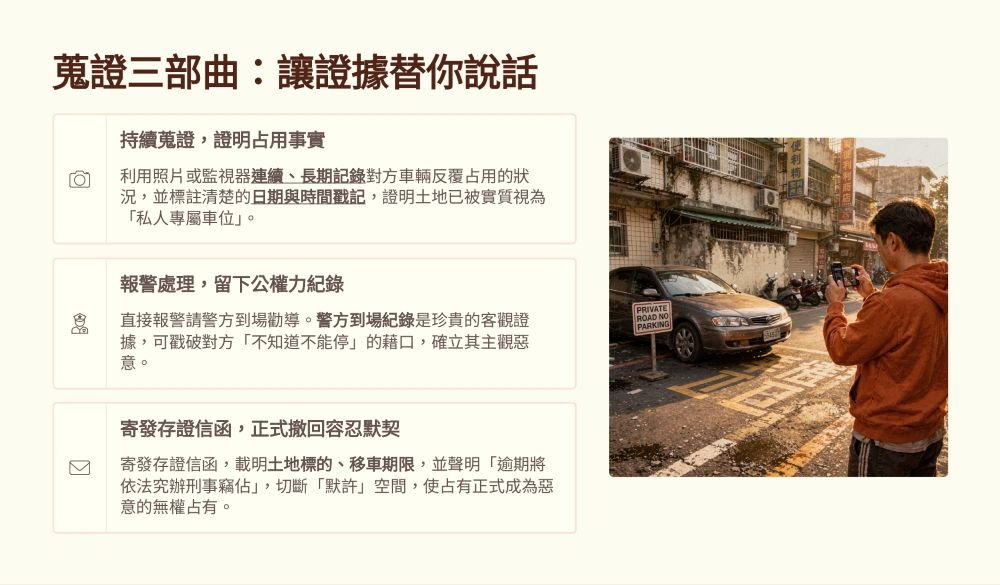 當鄰居長期霸占私人土地、屢勸不聽,你可以用 3個關鍵步驟蒐證反擊:📸 持續蒐證👮♂️ 報警留下紀錄📩 寄發存證信函