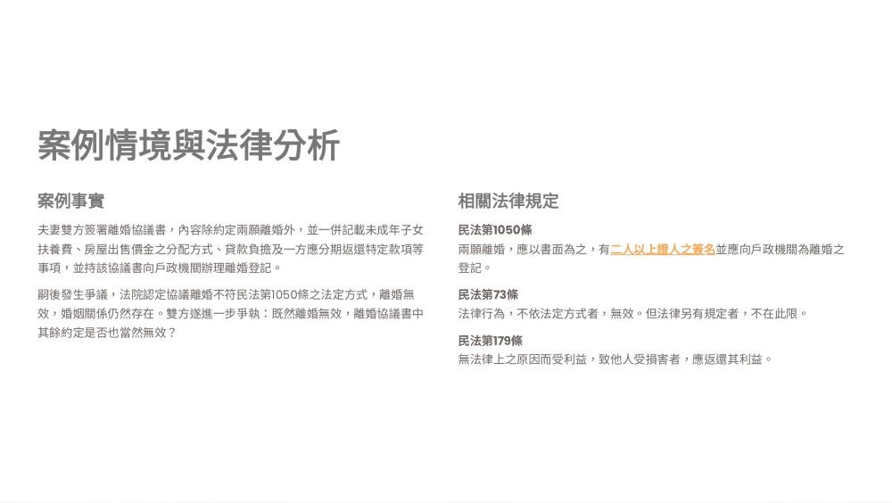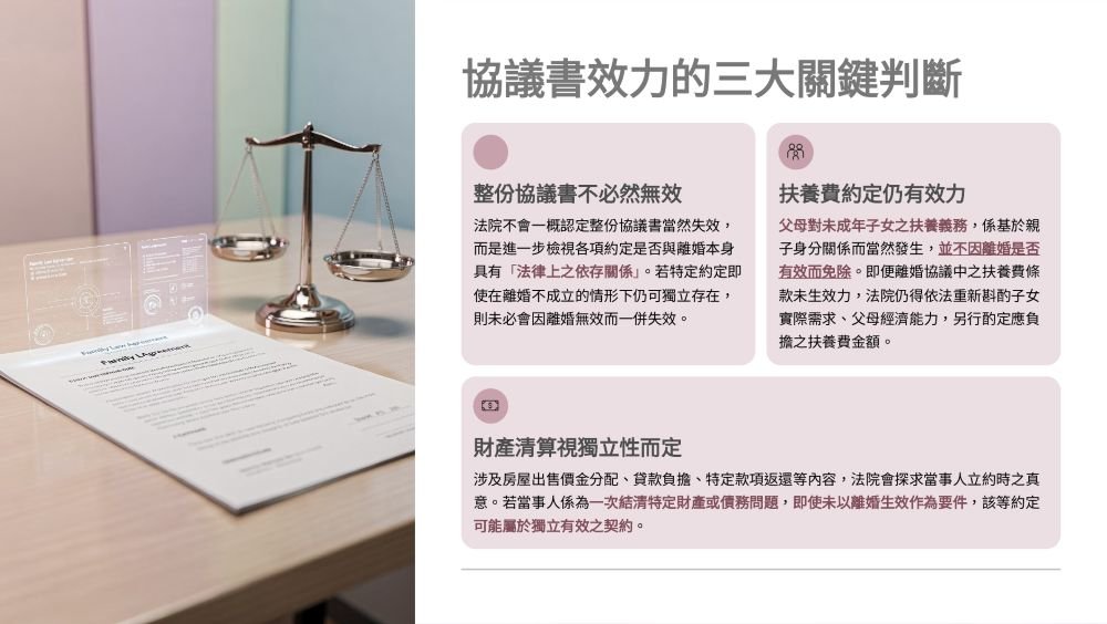 離婚被法院認定無效,是不是代表整份離婚協議書都作廢?🤔其實未必!扶養費、財產分配、金錢給付等條款,是否「跟著離婚一起失效」,關鍵在於是否以離婚成立為前提。